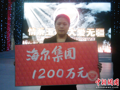 中新網4月21日電 4月20日,由中宣部、國家廣電總局、民政部、中國紅十字會主辦,中央電視臺承辦的《情系玉樹 大愛無疆--抗震救災大型募捐活動特別節(jié)目》在中央電視臺現(xiàn)場直播。海爾集團在現(xiàn)場向災區(qū)捐款1200萬元,全力支持災區(qū)緊急救災和災后重建工作。