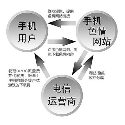 “簡(jiǎn)單來(lái)說(shuō),一條手機(jī)色情信息內(nèi)容的發(fā)布,一般要經(jīng)過(guò)三個(gè)環(huán)節(jié):運(yùn)營(yíng)商(主要是指各種手機(jī)圖片、鈴聲、視頻、文字、游戲等內(nèi)容發(fā)布平臺(tái)和渠道的提供者)、SP和WAP網(wǎng)站。”北京郵電大學(xué)一個(gè)曾長(zhǎng)期關(guān)注移動(dòng)增值業(yè)務(wù)的人透露,“SP在運(yùn)營(yíng)商和WAP網(wǎng)站間牽線搭橋,三者已形成捆綁各方的利益鏈,一旦獲利,三方都有收益!