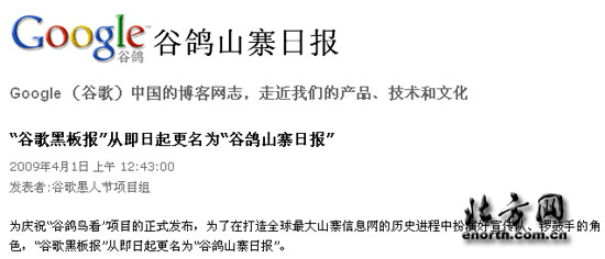 同時(shí),為慶!肮萨濜B看”項(xiàng)目的正式發(fā)布,谷歌中國的官方博客“谷歌黑板報(bào)”也在今日“撰文宣布“改名”為“谷鴿山寨日報(bào)”。該博客稱:“為了在打造全球最大山寨信息網(wǎng)的歷史進(jìn)程中扮演好宣傳隊(duì)、鑼鼓手的角色,‘谷歌黑板報(bào)’從即日起更名為‘谷鴿山寨日報(bào)’”。但記者注意到,該日志的發(fā)布者署名為“谷歌愚人節(jié)項(xiàng)目組”,想必“谷鴿鳥看”和“谷鴿山寨日報(bào)”的改名行動(dòng)都是今天這個(gè)特殊節(jié)日的一部分。