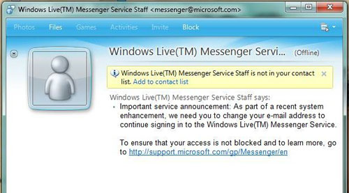 這個聲明稱,作為最近系統(tǒng)升級的一部分,我們需要你們修改你們的電子郵件地址以便繼續(xù)登錄Windows Live Messenger服務。為了保證你的訪問不被封鎖和了解更多的內(nèi)容,請訪問微軟技術支持網(wǎng)站/gp/Messenger/en。