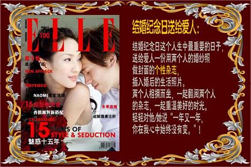 在情人節(jié)的清晨把它們放在餐桌上吧,當身邊的戀人吃早餐時,隨手拿起報紙和雜志,當看到印刷精美的雜志時,發(fā)現(xiàn)自己竟然上了雜志的封面、成為雜志的封面人物。一定不敢相信自己的眼睛,會大吃一驚的!為了效果更好,強烈建議買家把個性的封面、內頁跟真雜志裝訂在一起,這樣就更像一本正式發(fā)行的雜志,這樣也就更會讓對方有意想不到的驚喜了!