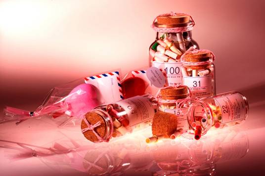 這就是很有人氣、創(chuàng)意兼可愛的情書膠囊,號稱用整瓶甜蜜的膠囊,道出永遠愛你的理由,補充關懷、補充愛!玄機在哪里?打開它試試看吧!原來每個膠囊里面都藏有一個空白小紙條,用來寫下對愛人想要說的話,寫好后把它卷起來用膠囊里精致的金屬小環(huán)套住再放回去。如此炮制一周用量的愛,當然,只要你的情話源源不絕,那么預約一整年的愛意表達也很不錯。寫好后,趕快把它們交給專屬你的“病號”,記得要叮囑對方每日服用,相信沒有誰可以抵抗得了這份浪漫,發(fā)現(xiàn)秘密后得到的意外驚喜一定會讓其感動良久。