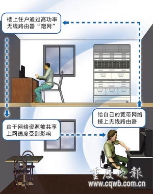 “這簡直與偷盜無異。”家住石橋鋪科園一路的劉先生,最近家里的寬帶網(wǎng)絡總是“堵車”,有時連上個QQ都十分吃力,經(jīng)常斷斷續(xù)續(xù)。后來找人一看,原來是家里用的無線路由器,被樓上新搬來的租賃戶用筆記本電腦“順手牽羊”連上去了。
