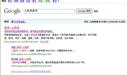 這兩天,你如果通過(guò)谷歌檢索“人民網(wǎng)讀書(shū)頻道”,檢索結(jié)果里會(huì)發(fā)現(xiàn)這樣的提示:“該網(wǎng)站可能含有惡意軟件,有可能會(huì)危害您的電腦。”