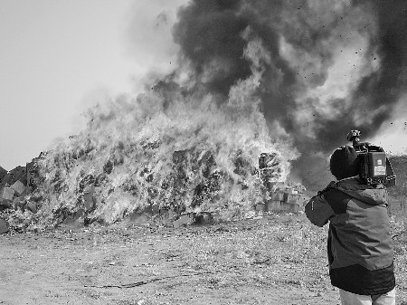 上午10:30左右,在經(jīng)過假劣藥械移交銷毀簽字儀式之后,點火開始。出席現(xiàn)場會議的相關(guān)領(lǐng)導(dǎo)首先點燃火把,引燃了浸透柴油的“藥山”;鹈畿f起幾十米高,熊熊的火焰頓時吞噬了數(shù)以萬計的偽劣藥械。熱浪掀起的滾滾濃煙中不時傳來響亮爆炸之聲,不少灌裝液、氣體藥瓶被炸得飛上了天。