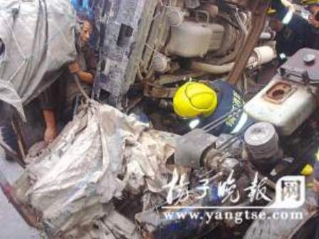 昨天清晨6時(shí)左右,在鎮(zhèn)江金橋大道卡口處,一滿載石料的貨車與一拖拉機(jī)發(fā)生相撞,蘇LC3×17的貨車車頭側(cè)翻后死死壓在拖拉機(jī)上,將拖拉機(jī)的簡(jiǎn)易駕駛室徹底壓趴后壓斷方向盤,導(dǎo)致拖拉機(jī)司機(jī)被困其間,雙腿被牢牢壓住。幸運(yùn)的是,司機(jī)的上半身沒有受傷,并且在兩車交接處有空隙,他還能時(shí)不時(shí)伸出頭來呼吸一點(diǎn)新鮮空氣。