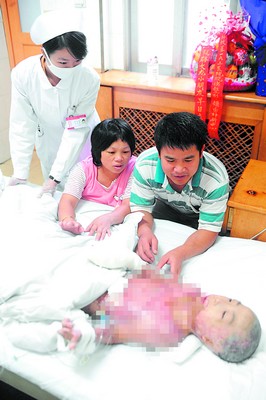 醫(yī)生告訴雷麗娟,孩子75%面積燒傷,無(wú)法痊愈,“你們花100萬(wàn)也治不好,就算治好也有可能落下殘疾!崩惥耆套⌒闹械谋,撫摸著文龍身上重重包裹的白紗布說(shuō):“不管你變成什么樣,永遠(yuǎn)都是媽媽的寶貝!就算上街乞討,也要把你治好!”第二天,雷麗娟和丈夫帶著孩子先后來(lái)到長(zhǎng)沙的4所醫(yī)院,但求醫(yī)未果。今年8月中旬,經(jīng)人介紹,孩子被送進(jìn)解放軍163醫(yī)院燒傷整形·頜面外科中心,醫(yī)生確診其為“全身燒傷后疤痕攣縮畸形”。
