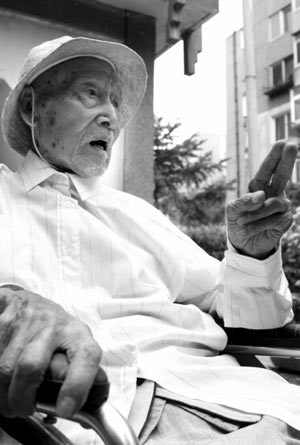 老人最喜歡吃的食品有牛奶、雞蛋、地瓜、香蕉、餃子、紅燒肉等。他從年輕時候起飯量就不大,從不暴飲暴食,現(xiàn)在每餐也只吃七八分飽,最喜歡的紅燒肉和餃子,也只吃五六口。社區(qū)醫(yī)院每月都來給老人檢查身體,老人各項指標均正常,沒住過醫(yī)院,感冒發(fā)燒都極少。前幾天高溫,老人患了肺內(nèi)感染,也只打了3天吊瓶,多打一天他都不讓,而且堅決不吃藥,他說“是藥三分毒”。老人滿口假牙,吃飯時飯菜必須軟爛;眼睛有些花,報紙上的大字還能看清;一只耳朵失聰,另一只耳朵有點背,跟他說話得大點兒聲。