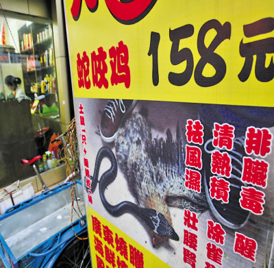 “打死我都不敢吃!”市民劉先生在黃泥塝看到某餐館推出的“蛇咬雞”招牌后說(shuō),這些吃法太怪了。劉先生介紹,招牌上還說(shuō),吃“蛇咬雞”可以醒腦、除雀斑、排臟毒、祛風(fēng)濕等!斑@不僅太殘忍,太血腥,也不道德。”張女士說(shuō),希望這僅僅是個(gè)別餐館吸引顧客而搞的噱頭。