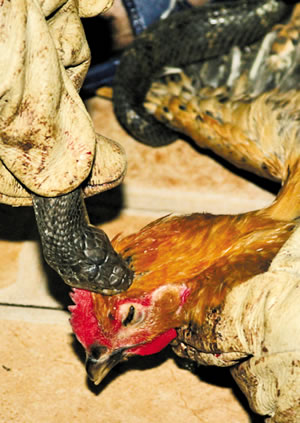“表演馬上開(kāi)始!”店里所有顧客都將眼光齊刷刷地盯著該男子的手。只見(jiàn)他左手將母雞死死按在地上,右手從鐵籠中隨手抓了一條長(zhǎng)約1米的眼鏡蛇,用手卡住它的頸部!芭尽⑴尽⑴!”只見(jiàn)男廚師不停地拍打著蛇的頭部,試圖激怒它,但眼鏡蛇仍一動(dòng)不動(dòng)。“怎么不咬呢?”幾名男子哈哈大笑,一些食客也一撥接一撥地走了進(jìn)來(lái)。