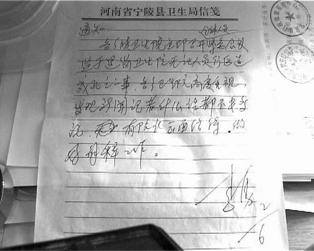 記者從寧陵縣衛(wèi)生局辦公室了解到,目前,因為無證行醫(yī)造成不良后果,王美英已經(jīng)被衛(wèi)生部門辭退。(記者陳海峰實習生曹杰文圖)