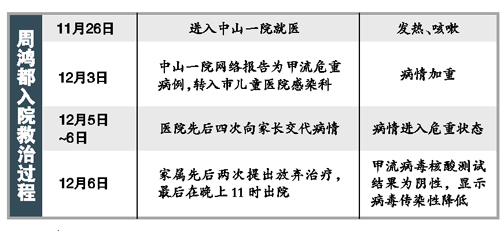 兒童醫(yī)院副院長龔四堂稱,入院時周鴻都呼吸急促、血氧飽和量低、心率快、反應差,當時就上了呼吸機,并且接受抗感染、糾正貧血等治療,入院的初步診斷是甲流、急性支氣管肺炎、呼吸衰竭、血小板減少性紫癜。到了第二天,他在呼吸機幫助下血氧飽和度已經(jīng)維持到正常水平,胸片顯示肺部大片感染,給予達菲等藥物治療。到了12月5日、6日兩天,他的病情進入危重狀態(tài)。根據(jù)通報,在12月6日,周鴻都的家屬共10多人來到醫(yī)院,先后兩次提出放棄治療,自動出院。