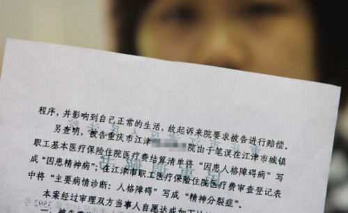 昨日,小玫趕到重慶向記者出示了調(diào)解書。法院查明,當(dāng)初醫(yī)院在小玫醫(yī)保住院醫(yī)療費(fèi)結(jié)算清單中將“因患人格障礙病”寫成“因患精神病”和在“職工醫(yī)保費(fèi)用審查登記表”病情診斷一欄中將“人格障礙”寫成了“精神分裂癥”,都是筆誤。經(jīng)過調(diào)解,醫(yī)院愿意將上述兩處“筆誤”改過來,即把精神病的鑒定刪去,不過依然保留對患者有“人格障礙”的結(jié)論。小玫說作為調(diào)解的條件,她放棄了6萬元的索賠請求。