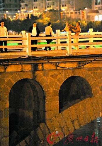 前晚,記者在事發(fā)現(xiàn)場(chǎng)看到,一個(gè)上身赤裸的男子情緒十分激動(dòng),一手“提”著小孩的腳,一手揮舞水果刀,站在橋欄旁將小孩甩來(lái)甩去,并時(shí)而將小孩“伸”出橋欄外,F(xiàn)場(chǎng)民警一邊與持刀男子展開(kāi)對(duì)話,勸說(shuō)其不要傷害小孩,一邊派熟悉水性的民警駕船到新豐江河中,以防萬(wàn)一。20多分鐘后,經(jīng)當(dāng)?shù)孛窬托膭裾f(shuō),該男子終于扔掉手中的水果刀,民警迅速包圍該男子將其擒住。(曾煥陽(yáng) 李燕南 黃贊福)