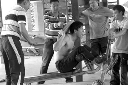 而劉翔的熱身也是慢跑和牽拉,這是他抵達廣州后的第一堂訓練課,師傅孫海平安排的內(nèi)容是調(diào)整訓練,練力量。幾組雙臂單舉后,劉翔已經(jīng)汗流浹背,于是他干脆脫下了上身的T恤。 “昨天在上海還很冷,現(xiàn)在已經(jīng)熱得我想喝冰水了。 ”接著,劉翔又仰臥在訓練器材上,進行負重式仰臥起坐,做了三組再換花樣。因為器材不順手,劉翔的手還磨破了,基地一位教練過來問好,順便關心劉翔現(xiàn)在的手推力量可以達到多少。 “120多公斤吧,現(xiàn)在也差不多。”孫海平答道。沒想到劉翔有意見了:“哪止啊,最高的時候可以到130公斤,師傅,你忘記了。科鋵嵃,不一定是推得多就說明什么,關鍵是力量用得到就行了……”