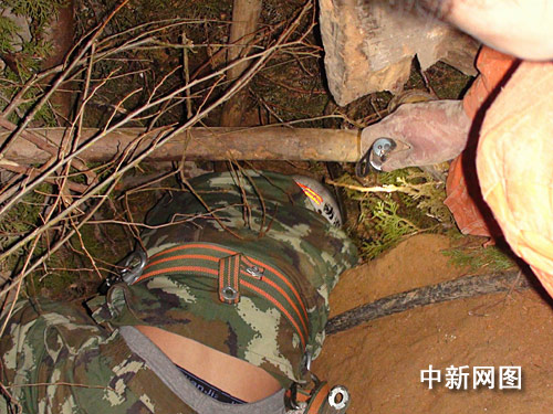 另一名被困人員身體被完全埋住,頭部被一塊巨石壓著,經(jīng)驗豐富的中隊指揮員經(jīng)過仔細觀察發(fā)現(xiàn),傷者的頭部被一塊巨石壓著,值得慶幸的是,這塊巨石被散落的小石塊支撐著,傷者的頭部雖然被卡在那里,但是沒有直接被巨石砸到。戰(zhàn)士劉闖找到一個有利位置,對傷者進行石塊清理,一邊與傷者講話,分散傷者注意力,減輕傷者痛苦。“轟隆……”又是一陣坍塌,中隊指揮員徐占杰躲閃不及被砸落的石塊,砸傷了腳。