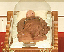 昨天政、商、宗教各界代表及信眾們前往瞻仰法師最后一面。方丈和尚向來賓講解懸掛堂中,書法家杜忠誥老師所寫的師父最后叮囑“寂滅為樂”以及四句偈“無事忙中老,空里有哭笑,本來沒有我,生死皆可拋!闭f明圣嚴法師一向“歡喜看生死”的態(tài)度。