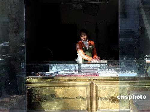3月14日,店面林立的拉薩市商業(yè)購(gòu)物街朵森格路,一家藏飾品店早早開門,服務(wù)員正在忙著收拾店面迎接顧客。中新社發(fā) 劉震 攝