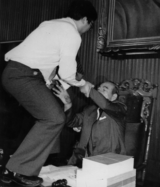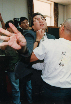 當(dāng)朱高正跳上主席臺(tái),議場內(nèi)頓時(shí)像爆發(fā)的活火山,趙少康等人沖上發(fā)言臺(tái),抓住高站在主席臺(tái)上的朱高正的腳踝。后排的“立委”則大喊“上。 薄按蛩浪,打死他!”,個(gè)個(gè)爭先恐后沖向主席臺(tái)。