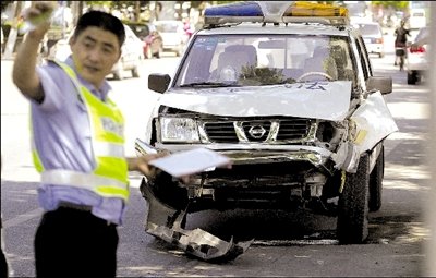 李先生隨即攔下一輛過路車,向西追去。皮卡在路上畫著“之”字形跑,逆行了100多米后,撞上了一輛正常行駛的送報自行車,送報員連人帶車重重摔倒在地。而皮卡車?yán)^續(xù)向前逆行了100多米,沖過順義五中大門,一頭撞上便道上的一棵樹后才停了下來。李先生和其他目擊者走近前發(fā)現(xiàn),肇事的皮卡原來是一輛城管執(zhí)法車,車上僅司機一人。該司機不是城管隊員,而是一名城管協(xié)管員。