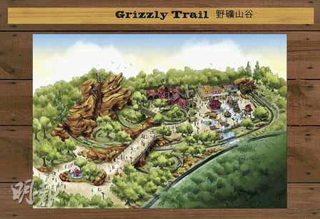 主題園區(qū)的故事設(shè)定于偏遠(yuǎn)淘金小鎮(zhèn),但大灰熊卻因淘金被觸怒。一班尋金者乘“大野礦山飛車(chē)”橫越整個(gè)小鎮(zhèn),但飛車(chē)在崎嶇斜坡上突然急速倒駛,一群實(shí)物原大的發(fā)聲機(jī)動(dòng)大灰熊也會(huì)施襲搞破壞,弄得乘客東歪西倒,最后更會(huì)觸動(dòng)炸藥裝置,令飛車(chē)從山中高速“噴射”出來(lái)!按笠暗V山飛車(chē)”相信是這次擴(kuò)建中,刺激度最高的一個(gè)設(shè)施。