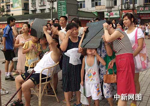 7月22日上午,500年一遇的日全食天文奇觀讓整個(gè)宜賓縣沸騰了,老老小小,男男女女都跑出來(lái)觀看。記者在現(xiàn)場(chǎng)看到,有戴著墨鏡觀看的,有拿望遠(yuǎn)鏡觀看的,有用焊工專用鏡觀看的,有拿茶葉包裝紙觀看的,有人用照相機(jī)照著相,有人用著攝像機(jī)……廣場(chǎng)上、院子里、壩壩頭到處站滿了人,大家都擠在一起驚嘆著:“看,太陽(yáng)慢慢變小了,成月亮了,只有光圈了,天黑了……”