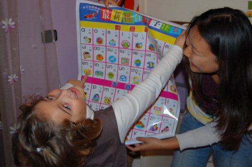 11月初我受邀來到馬爾蒂娜家里時(shí),她正在寫作業(yè),我在門外就聽到她嘴里還叨咕著乘法口訣。她做完了作業(yè),我問她用筷子技巧是否有進(jìn)步,她拉著我到廚房表演起來。為了表示對她進(jìn)步的肯定和鼓勵(lì),我送給她一本《漢語拼音趣味圖案冊》,并告訴她可以按照這些生動有趣的拼音圖案開始正式學(xué)習(xí)漢語。她手捧著禮物,深深地回送給我一個(gè)吻,這是意大利最傳統(tǒng)的表示問候或感謝的禮儀。