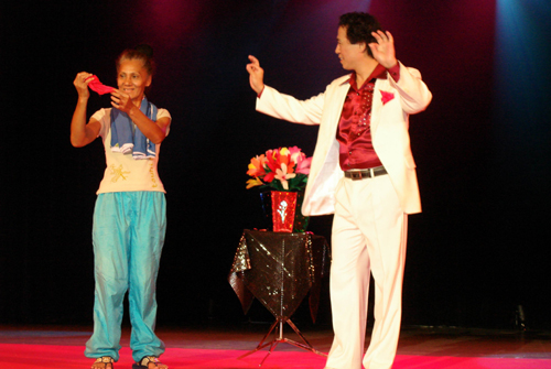 演出從活潑、歡快的空竹表演開始。藝術(shù)小組小演員們嫻熟地抖動(dòng)、拋起空竹的動(dòng)作,使現(xiàn)場(chǎng)不時(shí)爆發(fā)出熱烈的掌聲和歡呼聲。魔術(shù)演員敏捷的變幻手法則讓學(xué)生們睜大了好奇的眼睛。接下來的鉆桶、轉(zhuǎn)盤子節(jié)目,小演員們以風(fēng)趣幽默的表演和頂上、手上技巧表現(xiàn)出熱鬧的生活場(chǎng)景,引來學(xué)生們陣陣歡笑。柔術(shù)則以柔美的肢體語言和行云流水般的輕盈舞姿,獲得觀眾不停的贊嘆聲。壓軸的川劇變臉、吐火表演又讓觀眾領(lǐng)略了中國(guó)傳統(tǒng)戲曲藝術(shù)的獨(dú)特魅力。