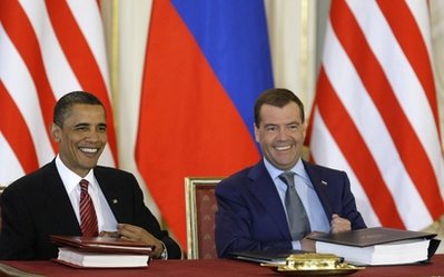 當(dāng)?shù)貢r(shí)間8日,俄羅斯總統(tǒng)梅德韋杰夫與美國總統(tǒng)奧巴馬在捷克首都布拉格城堡舉行會(huì)面,雙方進(jìn)行了私人會(huì)談。中午,兩人在捷克總統(tǒng)府西班牙大廳舉行了隆重的削減進(jìn)攻性戰(zhàn)略武器新條約簽署儀式。這被認(rèn)為是俄美“重塑”兩國關(guān)系的關(guān)鍵之舉。