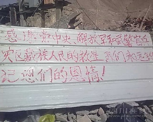據當地媒體報道,救援隊員不顧疲勞,盡全力救人,餓了干吃方便面,累了就靠著廢墟休息。面對來自全國各地救援隊的忘我援助,玉樹州一職業(yè)技術學校的學生書寫標語:感謝黨中央、解放軍和武警官兵,災區(qū)藏族人民的救星,我們永遠銘記您們的恩情。