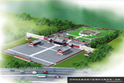 長(zhǎng)春園宮門古時(shí)專供皇帝出入,盛時(shí)列序于圓明園大宮門之后,俗稱“二宮門”。昨天,長(zhǎng)春園宮門和門前兩個(gè)朝房的主體建筑已完工,建筑外還搭著腳手架。圓明園管理處負(fù)責(zé)人表示,開(kāi)春將完成最后的油漆彩繪以及地面鋪磚工作,五一將對(duì)游人開(kāi)放。