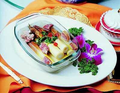 (5)春筍:被譽為“素食第一品”的春筍作為美味佳肴,自古以來備受人們喜愛。文人墨客和美食家對它贊嘆不已,有“嘗鮮無不道春筍”之說。春筍筍體肥厚,美味爽口,營養(yǎng)豐富,可葷可素。做法不同,風味也各異,炒、燉、煮、煨皆成佳肴。地方名菜春筍均占一席之地,如上海的“枸杞春筍”,南京的“春筍白拌雞”,浙江的“南肉春筍”。不過,北方很難吃到新鮮的春筍,如果是弗爾瑪林里泡過的就算了吧。