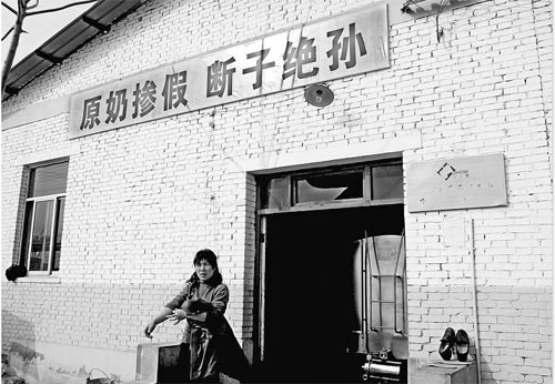 涇陽縣多家奶廠,近日都貼出同樣內容的一條雷人標語:“原奶摻假,斷子絕孫”。涇陽縣蔣路鄉(xiāng)澳西牧場63歲的飼養(yǎng)員董學文說,看到這個標語就不舒服。張貼標語的公司希望各方面汲取三聚氰胺事件的教訓,標語的目的在于警示,也表明企業(yè)抓質量的態(tài)度。牧場總經理梁軍表示,他能理解公司這么做的初衷,但內容值得商榷。(魏光敬 謝勇強攝影報道)