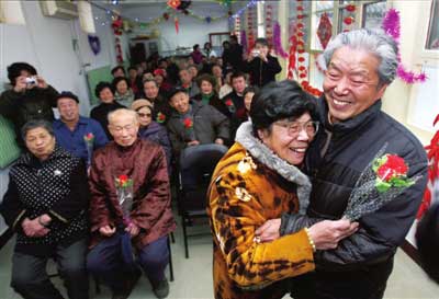 “親愛的,感謝你!”昨天下午,東城區(qū)史家社區(qū)居委會(huì)內(nèi),近20對(duì)年近古稀的老夫妻聚在一起,其中4對(duì)已過金婚。他們學(xué)習(xí)牽手、擁抱、送玫瑰,“惡補(bǔ)”情人節(jié)知識(shí)。相濡以沫的老夫妻們,第一次嘗試開口向?qū)Ψ酱舐曊f愛,雙方都不好意思地扭過頭,現(xiàn)場一片掌聲。