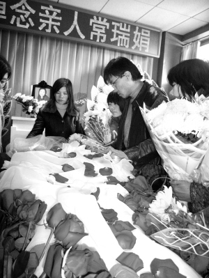 昨天上午9時(shí)許,八寶山殯儀館百合廳門前聚集著許多手持菊花的人,他們都是為常瑞娟送別的。隨后,娟子的男友劉貴年帶著娟子的家人走進(jìn)百合廳。他面容憔悴,嘴唇毫無血色。殯儀廳的中央,娟子靜靜地躺在那里,身穿潔白的婚紗,身上被鮮艷的紅玫瑰花瓣簇?fù)碇!霸谒∥5臅r(shí)候,我問她還能堅(jiān)持嗎?她拉著我的手,用盡全身力氣重重地點(diǎn)了點(diǎn)頭!眱x式上,劉貴年望著女友的臉述說著她的堅(jiān)強(qiáng),一直忍著只是哽咽的他突然發(fā)出撕心裂肺的哭聲。在他身邊,娟子的父母姐妹早已泣不成聲,在場(chǎng)的人無不流下眼淚。在最后對(duì)遺體告別時(shí),劉貴年一直撫摸著娟子的臉。最后一刻,他突然低下頭,深深地吻向女友。