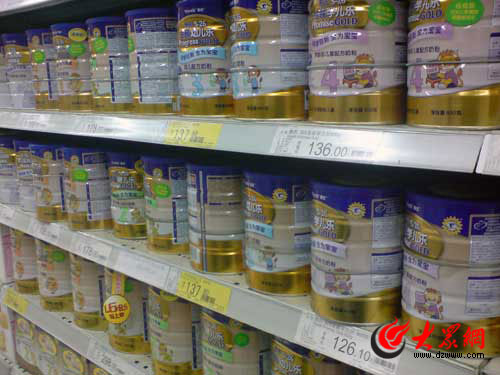 24日上午,記者在大潤(rùn)發(fā)歷下店和濟(jì)南銀座商城的奶粉柜臺(tái)看到,惠氏奶粉仍然擺在貨架上,價(jià)格也未發(fā) 生變化;而在家樂(lè)福超市,記者看到惠氏奶粉已經(jīng)被擺上了促銷(xiāo)柜臺(tái)的顯著位置,記者注意到,惠氏2段S26金 裝健兒樂(lè)900克聽(tīng)裝奶粉當(dāng)天售價(jià)仍然是178元,而惠氏3段S26金裝健兒樂(lè)900克聽(tīng)裝奶粉售價(jià)已從155.8元直降 到137.8元,降幅達(dá)到18元。銷(xiāo)售人員告訴記者,惠氏被曝光的事她已經(jīng)知道,但并未接到下架通知,盡管她表示惠氏降價(jià)與“結(jié)石門(mén)”無(wú)關(guān),但記者從價(jià)格標(biāo)簽上看到,降價(jià)銷(xiāo)售的標(biāo)簽是24日當(dāng)天新?lián)Q的;在沃爾瑪超市,記者看到惠氏同樣在降價(jià)促銷(xiāo),降幅與家樂(lè)福相同。