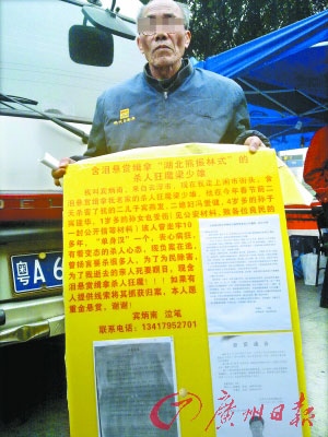 本報(bào)訊 (記者何濤)昨日下午2時(shí)30分,72歲的老漢賓炳南站在廣佛路口的馬路邊上,舉著一個(gè)大大的招牌:懸賞緝拿殺人狂魔!老人的舉動(dòng)吸引了不少路人圍觀,站在細(xì)雨中的老人一遍遍地向圍觀的人講述他的故事:今年春節(jié)前兩天,他的兒子、兒媳、孫子3人在云浮的家中被殺,與他同村的梁某有重大作案嫌疑。當(dāng)?shù)鼐揭褜?duì)梁某發(fā)出了懸賞通告,但為了早點(diǎn)抓到疑犯,他開始了奔走各地自發(fā)“民間通緝令”的歷程。