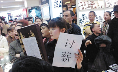 “三八”節(jié)本該是婦女的節(jié)日,然而這一天重慶解放碑鬧市某商場(chǎng)卻出現(xiàn)了一名漂亮女子舉紙條討薪維權(quán)的場(chǎng)面,驚動(dòng)了110民警。原來(lái),這名討薪女子是廣州一家公司駐該商場(chǎng)的營(yíng)業(yè)員,因未接待顧客被公司罰款100元,拒交后又遭到調(diào)崗處理。雙方關(guān)系“拉爆”后,遂來(lái)到商場(chǎng)追討千余元欠薪。昨天,經(jīng)渝中區(qū)勞動(dòng)局介入,當(dāng)事雙方已達(dá)成協(xié)議,公司方面支付了她3年多的保險(xiǎn)金,欠薪也即將支付。