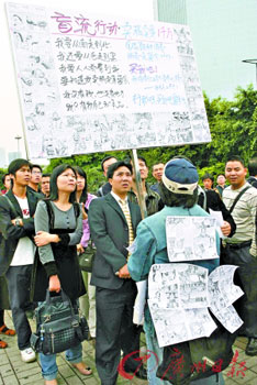 漫畫(huà)家名為黃達(dá)沖,在天河體育中心南門(mén)廣場(chǎng)舉著一面與他身高差不多的鐵牌,上面展示了他的“三國(guó)英雄前傳”漫畫(huà)以及他的宣言:“盲流行動(dòng)·賣(mài)稿賣(mài)身一千萬(wàn)……”他一身牛仔套裝上前身后背也貼著多張漫畫(huà)作品,引得路人圍觀。何謂“盲流”?他解釋道,他是南寧人,來(lái)廣州十年,做過(guò)出版和媒體工作,現(xiàn)在快40歲了,還沒(méi)找到方向,所以認(rèn)為自己是盲流。“我去年11月開(kāi)始創(chuàng)作‘三國(guó)英雄前傳’,現(xiàn)在完成了一半,今天來(lái)到這里想找人投資。如果有誠(chéng)意的話,私下談價(jià)錢(qián)……一千萬(wàn)嘛,不一定是人民幣!痹谂赃呥有一位長(zhǎng)發(fā)壯漢,是黃達(dá)沖的“哥們”,也是一位“自由藝術(shù)家”,正幫著他派傳單。