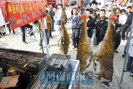 “呀!這是梅花鹿?是保護(hù)動物吧?太殘忍了!”圍觀的市民對攤位里穿著紅肚兜、伴著“舞曲”邊烤邊扭的攤主和他手里的“天價肉串”并不是很感興趣,而是對攤位前鐵架上懸掛的三只死去的梅花鹿指指點點。