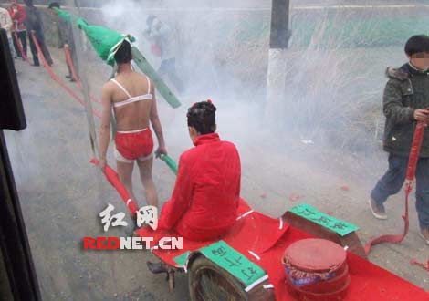 這篇名為《農(nóng)村最驚悚雷人婚禮 模仿“牛頭馬面”》的圖片帖中,一男子拖著架板車,他歪帶著一頂綠色馬頭的帽子,上半身穿著女士的內(nèi)衣,下半身穿著紅色的短褲,全身紅與綠的色彩搭配十分搶眼。而板車上的女士則穿著大紅色的裙子,并無(wú)特別,女士身后還放著幾大盒未開(kāi)封的紅皮鞭炮。看圖片中人們的衣著打扮比較厚實(shí),應(yīng)為冬末春初舉辦的婚禮。