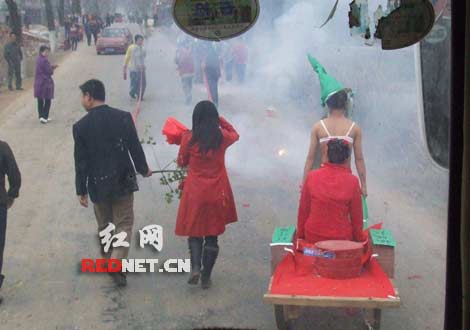 “誰(shuí)若97歲死,奈何橋上等三年!比绻堰@句歌詞中纏綿悱惻的場(chǎng)景搬到婚禮中演繹,會(huì)不會(huì)有點(diǎn)驚悚?25日上午,網(wǎng)友“鍋爐工”在紅網(wǎng)論壇發(fā)帖,再現(xiàn)了一場(chǎng)“雷人”婚禮,帖子描述道“這男人扮牛頭,拉個(gè)‘投胎轉(zhuǎn)世車’拖著老婆回家,新娘后面放著幾掛鞭炮,據(jù)說(shuō)是驅(qū)鬼用,拉著上‘奈何橋’好恐怖!”