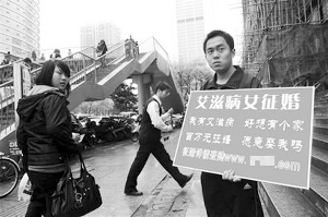 3月28日,武昌中南商業(yè)大樓前,一青年男子手舉一塊廣告牌,聲稱為身家百萬(wàn)的艾滋病女患者征婚。舉牌的男子自稱姓鐘,在武漢辦了一網(wǎng)站。該“艾滋女”以9.7萬(wàn)元租下了他網(wǎng)站的首頁(yè),要求專門(mén)為她做征婚廣告,還要求他在中南大樓前舉兩天的征婚廣告牌,她每天給網(wǎng)站1000元的報(bào)酬。