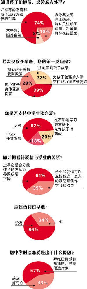 如果自己的孩子早戀,約七成人表示將以寬容理解的態(tài)度來(lái)處理。僅兩成受訪者表示,發(fā)現(xiàn)后會(huì)命令其立即停止戀愛,把愛情扼殺在搖籃中。另有一成人則表示“不干涉,順其自然”。記者 張淑敏
