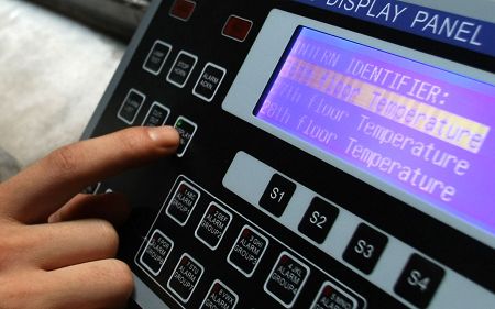 在昨日的試驗中,工作人員在26層電梯門上方的煙感器附近點燃打火機,當溫度超過58℃后,樓道內(nèi)的語音報警響起,“各位業(yè)主,本樓層發(fā)生火災,請不要驚慌,本樓層電梯暫時停止使用,請業(yè)主改乘其他樓層的電梯疏散!彪S即,26層的電梯按鈕“失靈”,其他樓層電梯仍正常運行。