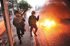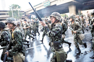 在泰國(guó)總理阿披實(shí)12日宣布曼谷和周邊5府部分地區(qū)進(jìn)入緊急狀態(tài)后,泰國(guó)軍隊(duì)和警察開(kāi)始在重要路段部署兵力。13日凌晨4時(shí)30分,數(shù)百名士兵在丁當(dāng)?shù)貐^(qū)采取的驅(qū)散行動(dòng)中與示威者發(fā)生嚴(yán)重沖突。阿披實(shí)說(shuō),約70人在沖突中受傷,其中23人為士兵,大部分為催淚彈所傷,無(wú)人喪生。