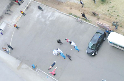 昨天,該校一名現(xiàn)場(chǎng)目擊者陳姓學(xué)生透露,先聽(tīng)到有一男一女的爭(zhēng)吵聲,接著聽(tīng)到一個(gè)女生的嘶喊聲,后來(lái)就看到一女一男先后從公寓樓墜下。當(dāng)天下午6:40左右,北京朝陽(yáng)警方迅速封鎖現(xiàn)場(chǎng),展開(kāi)調(diào)查。另一目擊者說(shuō),當(dāng)晚6:20,一名女生從靜思苑13層?xùn)|南側(cè)樓梯窗口墜下,5分鐘后男生從同一位置墜下。墜樓后,兩人橫躺在宿舍樓南側(cè)的地面上,女生穿粉紅色睡衣,男生光著上身,下身穿牛仔褲,身下有大片血跡。原來(lái),兩人墜樓的窗臺(tái)高約1米,窗戶(hù)面積不足1平方米,窗戶(hù)的紗窗已被撕開(kāi),一件藍(lán)色運(yùn)動(dòng)上衣還留在窗臺(tái)上,附近地面上還有數(shù)根煙頭,該樓一層?xùn)|側(cè)入口處的欄桿也被砸斷!