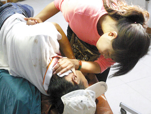 昨日下午3點(diǎn)多鐘,脖子血流不止的周方被救護(hù)車(chē)送進(jìn)市急救中心后拒絕進(jìn)入急診室接受治療。記者看到,周方的脖子左側(cè)有一道長(zhǎng)約6公分的刀傷,鮮血直流,染紅了白色T恤和頭上的棒球帽。醫(yī)護(hù)人員和匡非好不容易將他勸進(jìn)去,他卻趴在病床上痛哭不已,約10分鐘后,才平靜下來(lái),接受了縫合處理。據(jù)醫(yī)生介紹,周方的傷口淺,未傷及主動(dòng)脈,無(wú)生命危險(xiǎn)。