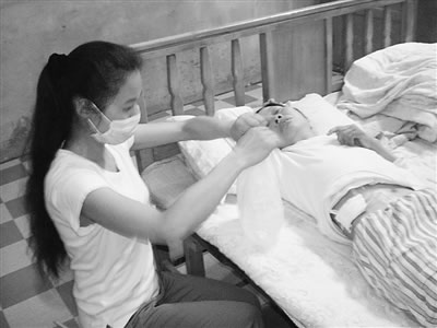 張錦現(xiàn)在每天都會(huì)為母親做三次“水透”。為了讓置放在母親體內(nèi)的輸液管不被細(xì)菌感染,她就將家里的窗戶緊閉,以防灰塵進(jìn)入。