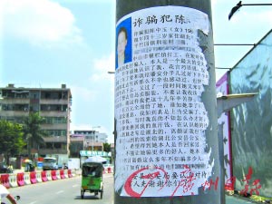 中山雅商律師事務(wù)所的律師封謨喜對(duì)記者表示,“公開把別人的身份資料貼在公共場(chǎng)合,這是違法的行為。輕則違反《治安管理處罰條例》,重則構(gòu)成了犯罪。如果貼了幾十張,這種行為其實(shí)算是比較嚴(yán)重了。”此外,封律師對(duì)記者表示,未經(jīng)審判,直接稱他人為“詐騙犯”,這也是侵害名譽(yù)權(quán)的行為。封律師表示,若認(rèn)定被詐騙可向公安部門報(bào)案(記者張堅(jiān)攝影報(bào)道)